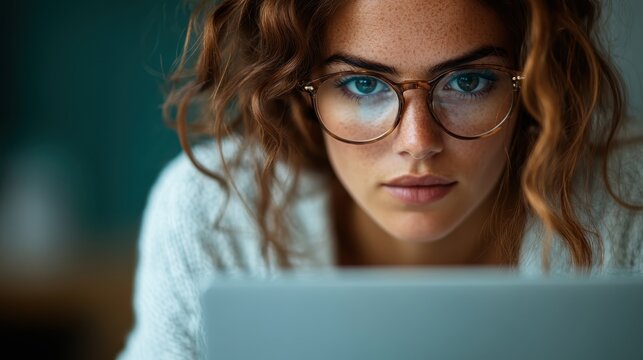 A close-up portrait of a woman with glasses, focused intently on her laptop screen, capturing the essence of education, determination, and modern technology.