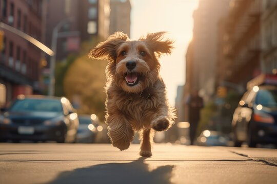 A playful and curious dog runs quickly along a sunny city street.