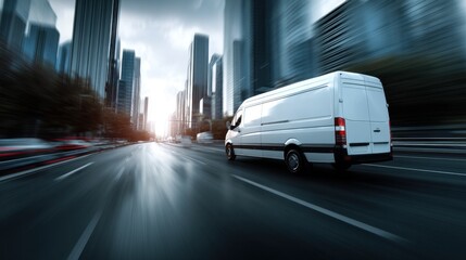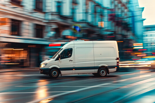 A delivery van drives quickly on a busy city street during dusk. Tall buildings line the road while other vehicles also move. The sunset provides a low light.
