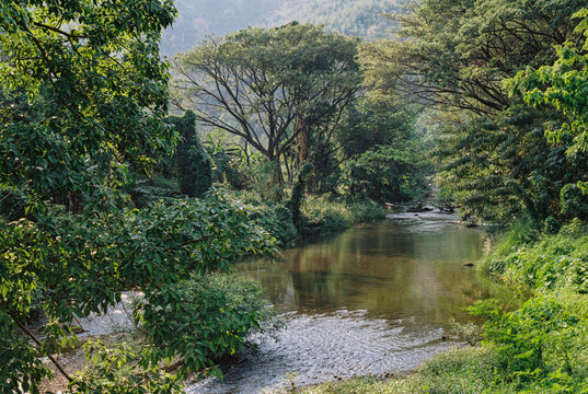 A river flowing through a quiet forest,