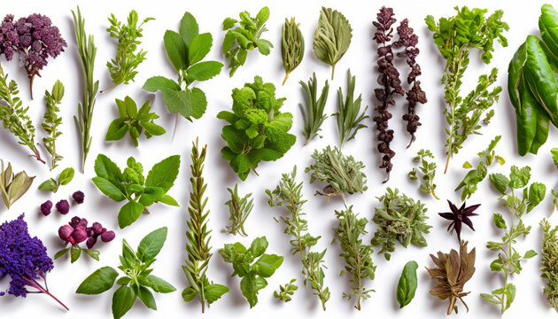 Variety of medicinal plants, each with their unique healing properties, beautifully isolated against a  white background, symbolizing nature’s pharmacy