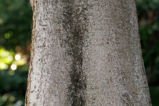 Bark of Rauvolfia afra in family Apocynaceae. Whitish grey trunk of quinine tree. Texture of tree. Botanical garden Puerto de la Cruz, Tenerife. Nature concept.