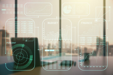 Double exposure of abstract creative statistics data hologram and modern desk with computer on background, analytics and forecasting concept