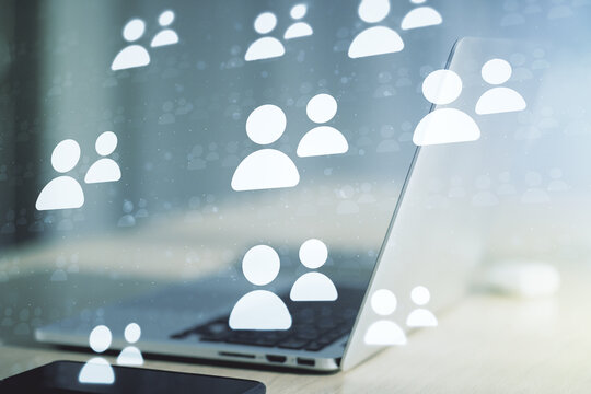 Social network concept with modern laptop on background. Multiexposure