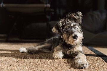 Quizzical dog lying on sisal mat in sunlight indoors