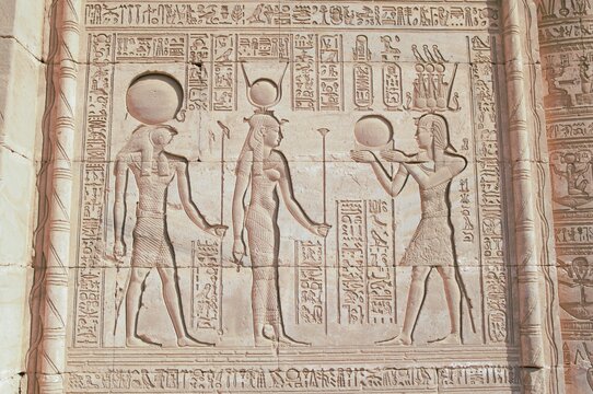 Ancient egypt scene. Hieroglyphic carvings on the exterior walls of an ancient egyptian temple