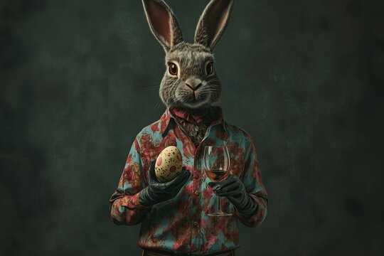 A stylish anthropomorphic rabbit holds a glass and an egg in a dark, whimsical setting