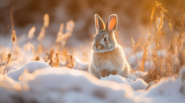 Adorable brown cottontail rabbit in sunlit meadow among wildflowers