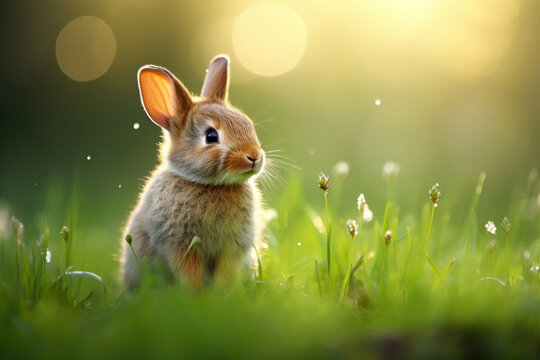 Wild rabbit in green meadow during golden hour