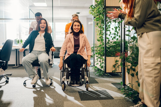Diverse female coworkers racing office chair through modern open-plan office, laughing