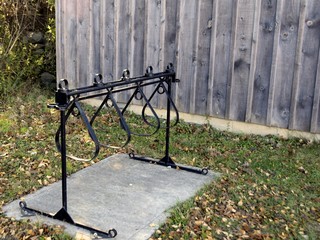 vintage metal bicycle rack on a concrete foundation near a wooden wall