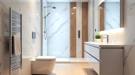 Modern luxury bathroom with sleek vanity glass shower enclosure and heated towel rack