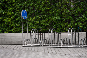 Empty stainless steel bicycle parking rack with a sign of bicycle parking with a green plants on a wall.