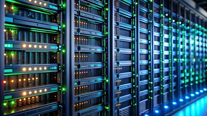 rack. Close-up of glowing blue server rack lights creating an abstract technological pattern on a dark background. product launch decks.