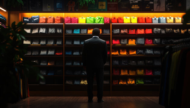 A man stands in front of a rack of colorful shirts. The man is wearing a suit and tie. The shirts are arranged in a row, with some being more colorful than others