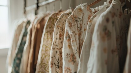 Row of clothes hanging on a rack in a closet. the clothes are neatly arranged in rows and are of different colors and patterns.