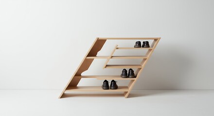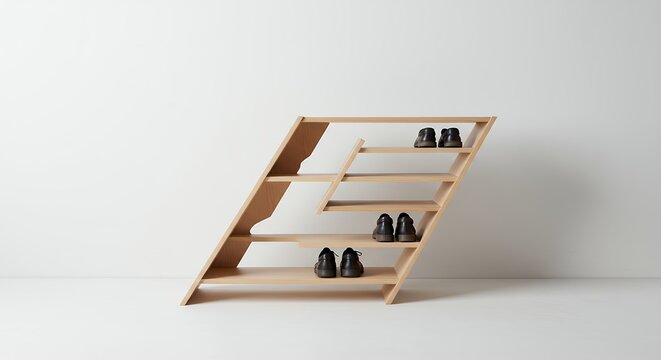 Modern kitchen interior with wooden storage stand and ceramic dishware on light wall background
