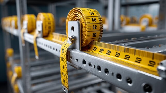 Close-Up of Measuring Tape Displayed on Rack Unit in Industrial Setting