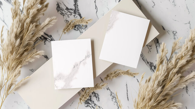 Two blank paper sheets mockup cards on a marble stand with pampas grass. Flat lay, top view. Minimal aesthetic business card with copy space for greeting, branding, logo, and invitation.