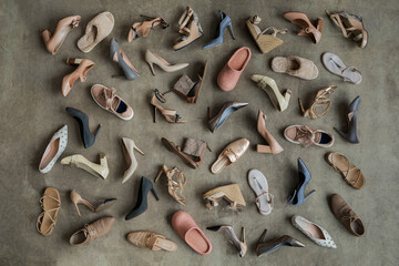 Top view many colored female shoes on gray floor ​fashion stylish footgear choosing