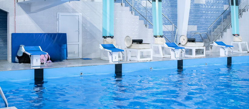 Empty shelves in new distribution warehouse. Metal equipment for storage, racks blue orange, pallet racking system
