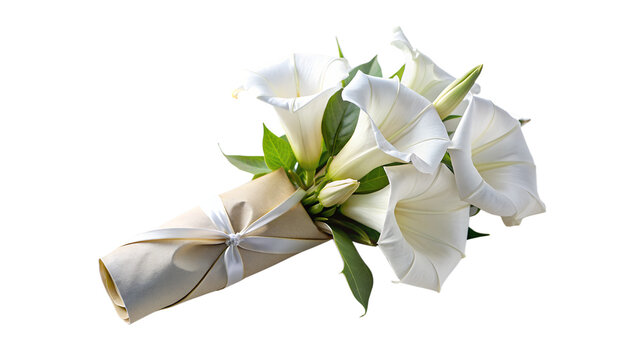 a beautiful bouquet of moonflower, elegantly wrapped in beige paper and adorned with a ribbon