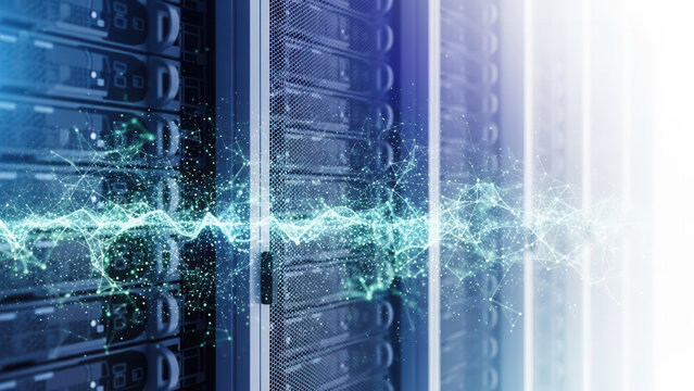 A high-tech server rack features blinking blue and green lights and organized cables, with space on the right for extra information