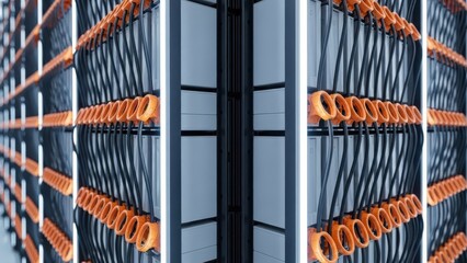 Fiber optic and ethernet cables are connecting server racks in a modern data center, ensuring high speed data transmission and network connectivity