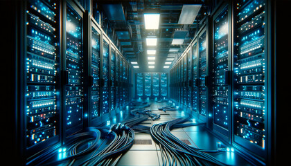 Housing rows of server racks in modern data center corridor with cool blue lighting