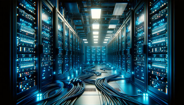 Multiple rows of servers neatly arranged in a vast data center, showing the scale and complexity of modern digital infrastructure