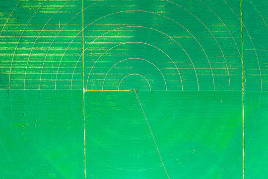 Aerial drone shot of a Pivot irrigation land a perfect green circle
