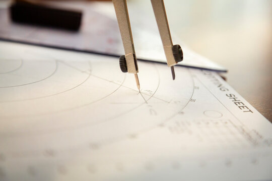 Closeup of a navigator's radar plotting chart with a triangler and compass divider and a calculated angle