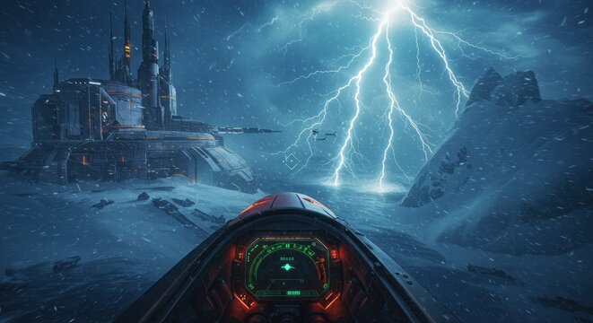 Immersive first-person perspective inside cockpit facing frozen landscape and futuristic