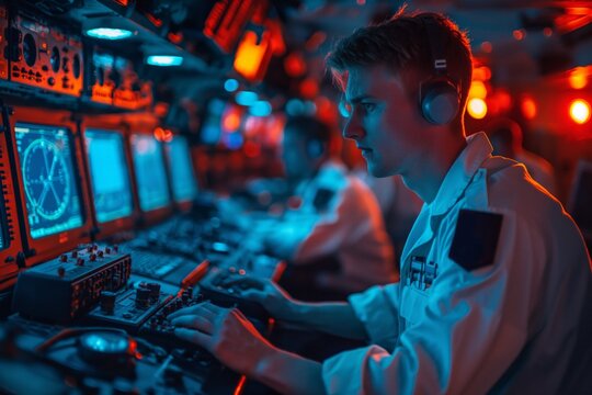 Intense young male operator monitoring radar screens in submarine's red-lit control room, Concept of naval surveillance and defense operations