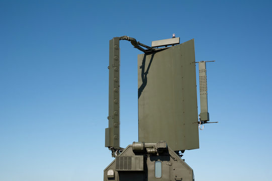 Green military radar - rotary device to scan, monitor and control air. Anti-aircraft defense. Copy space area of blue sky.