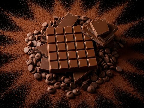 A delicious chocolate bar surrounded by cocoa beans and powder on a dark background