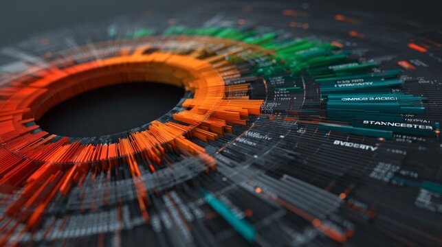 A 3D radial chart with glowing segmented sections in vibrant teal and purple floating in a dark digital environment