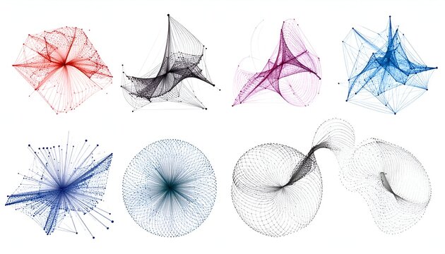 Abstract renderings of interconnected nodes forming 3D shapes with various colors, on white