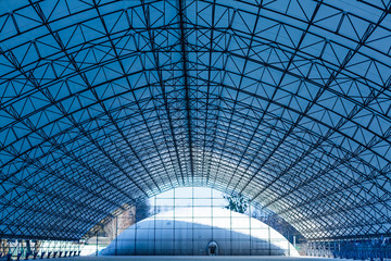 Double exposure photo of transparent circular glass ceiling / roof at two different zooms. Realistic but not real architectural image with doubled number of circles compared to the real object.