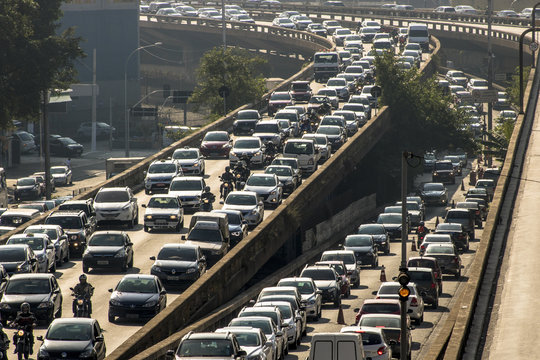 Sao Paulo, SP, Brazil, April 04, 2017. Heavy traffic on the East-West connection, Radial Leste Avenue, at morning day, in downtown Sao Paulo.