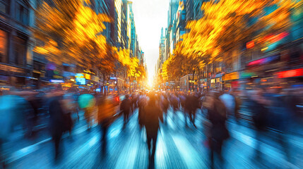 Dynamic blur crowd walking on downtown street at sunset with radial perspective and light creating sense of speed, movement and modern city energy