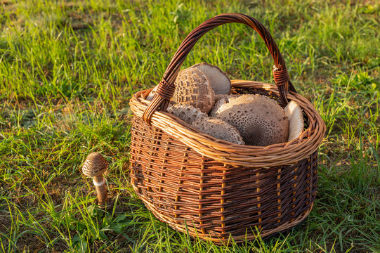 Wicker basket full of parasol mushrooms (macrolepiota procera) in morning sunlight