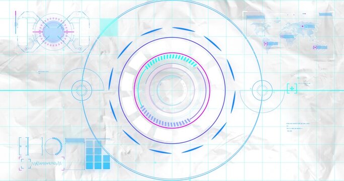 Futuristic hud interface with central pulsing reticle and circular data rings on grid