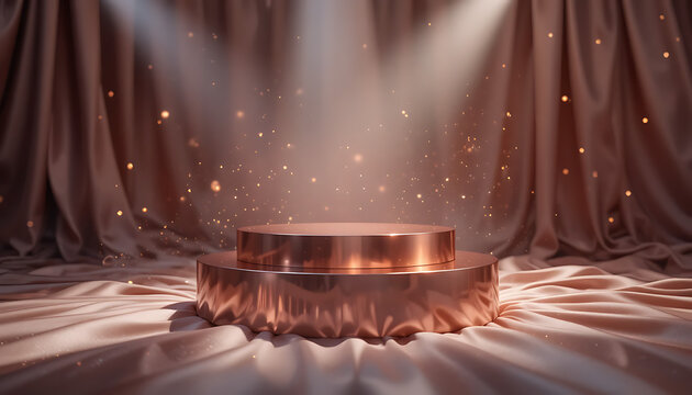 Elegant copper podium with soft draped fabric and shimmering particles illuminated by dramatic spotlights creating a luxurious and celebratory atmosphere for product display