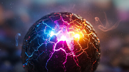 Dynamic energy core pulsating with radiant neon light through cracked dark surface, creating a powerful abstract visual effect with ethereal smoke