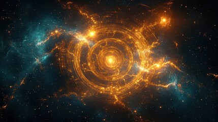 Glowing golden concentric energy rings with electric arcs and sparks over teal nebula clouds and starfield, evoking awe and cosmic mystery