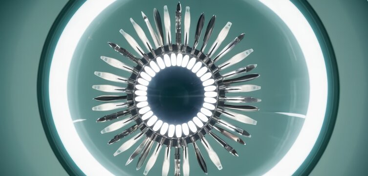 Futuristic intricate circular design showcasing a radiant core light ring and metallic blade elements