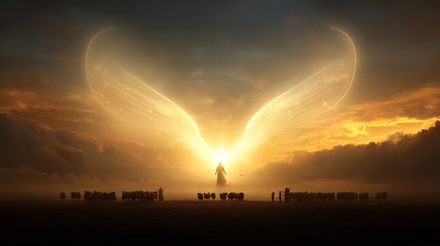 Angelic being radiates an ethereal light surrounded by glowing celestial clouds in a serene and spiritual composition as shepherds and their flock bask in the divine presence