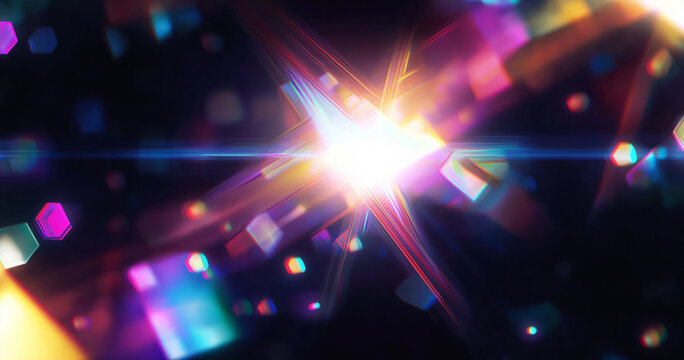 Radiating bright white light burst in abstract space, with multicolored streaks and golden bokeh
