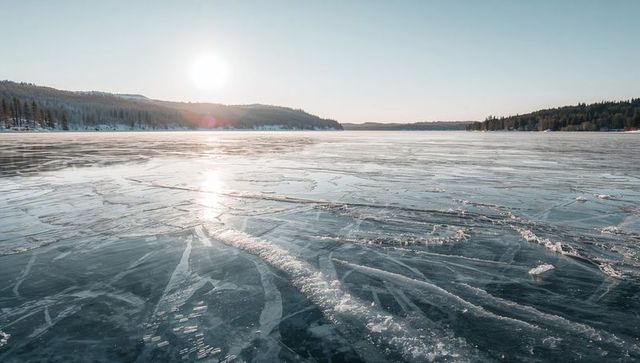 Sunlight reflecting on cracked ice of frozen lake at sunrise, winter forest horizon